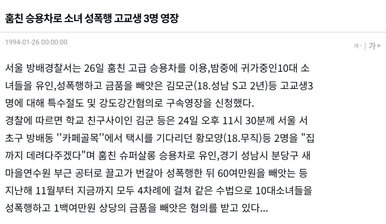 조진웅 1994년 사건 당시 기사 작성자 정보 최고관리자 작성일 2025.12.07 00:11 컨텐츠 정보 25 조회 0 댓글 0 추천 0 비추천 목록 https://plus.hankyung.com/apps/newsinside.view?aid=1994012600451 조진웅 76년생 1994년 사건당시 18세 성남 서현고 재학중 0 추천 추천 비추천 0 비추천 댓글 로그인한 회원만 댓글 등록이 가능합니다. 이전 다음 목록