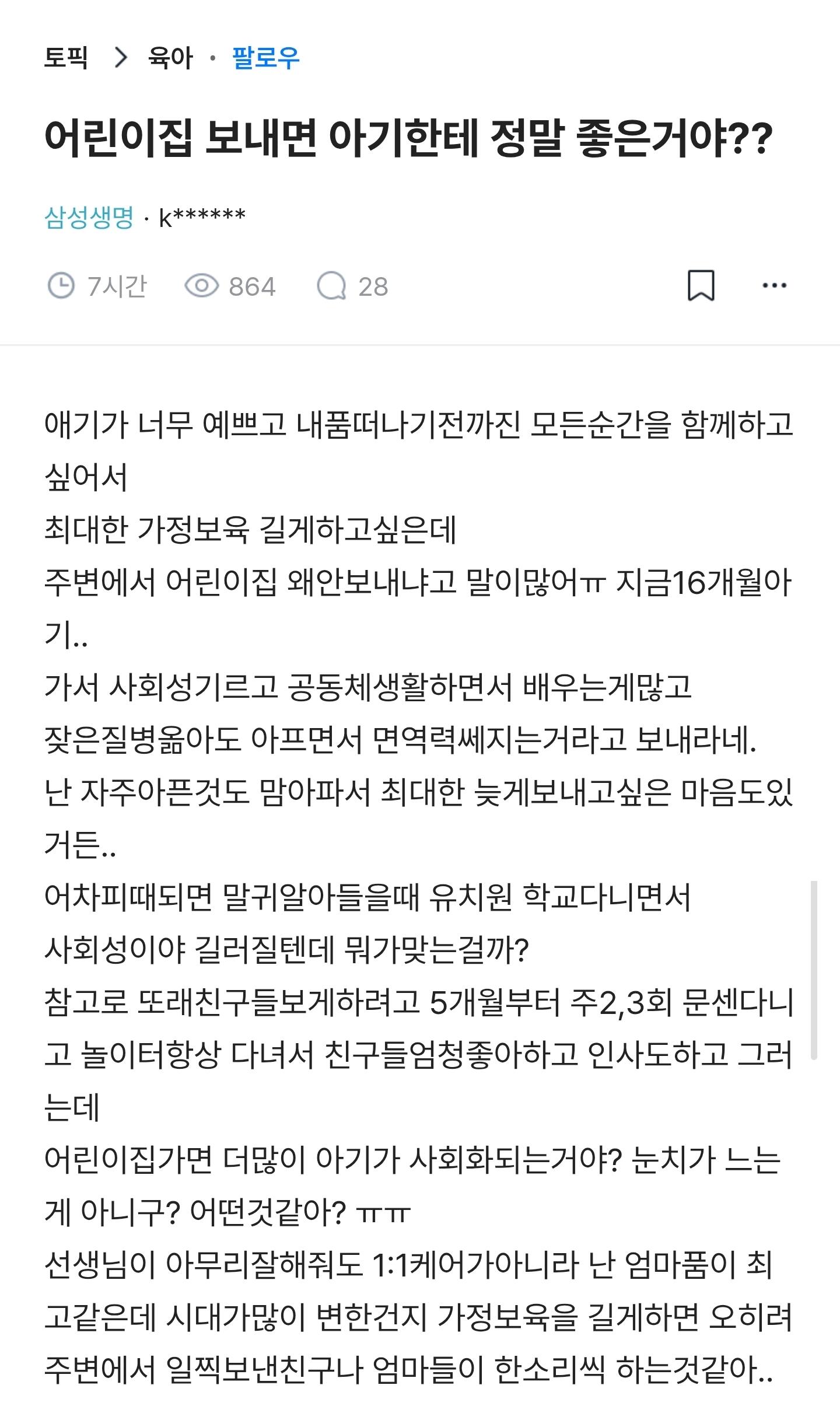 어린이집 보내면 아기한테 정말 좋은거야? 작성자 정보 최고관리자 작성일 2025.12.05 07:07 컨텐츠 정보 24 조회 0 댓글 0 추천 0 비추천 목록 0 추천 추천 비추천 0 비추천 댓글 로그인한 회원만 댓글 등록이 가능합니다. 이전 다음 목록