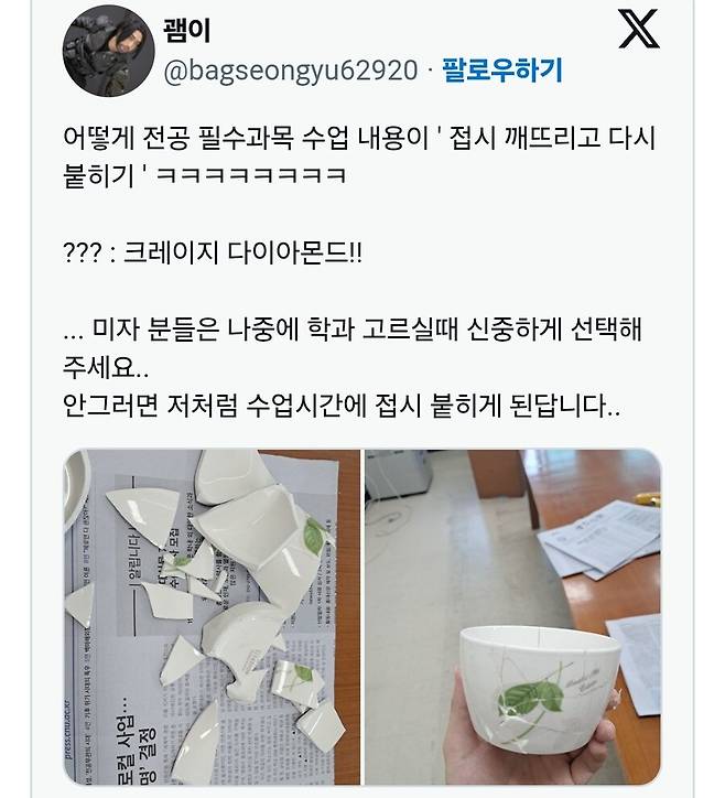 전공 필수과목 수업 내용이 <접시 깨뜨리고 다시 붙히기> 작성자 정보 최고관리자 작성일 10.12 12:52 컨텐츠 정보 24 조회 0 댓글 0 추천 0 비추천 목록 고고학과 0 추천 추천 비추천 0 비추천 댓글 로그인한 회원만 댓글 등록이 가능합니다. 이전 다음 목록
