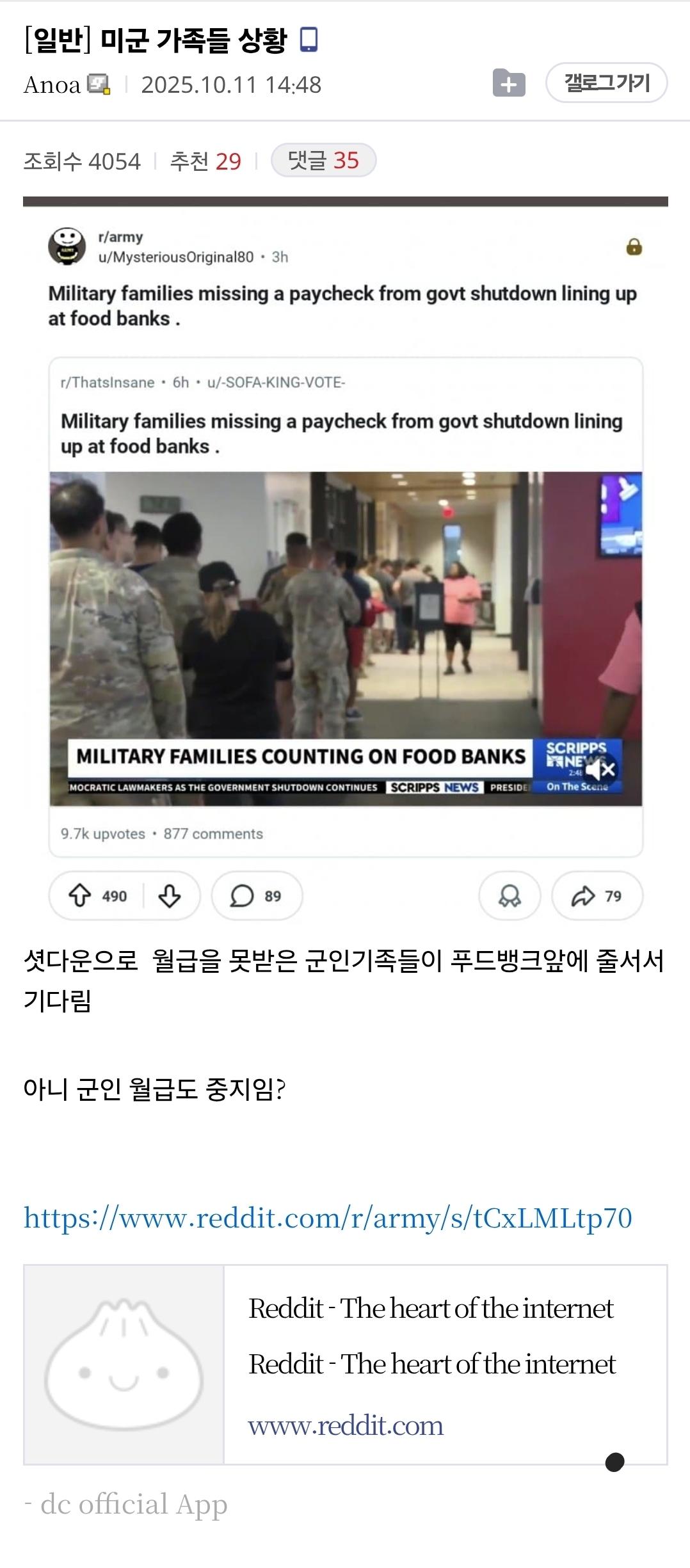정부 셧다운으로 군인 월급도 못주는 미국 작성자 정보 최고관리자 작성일 10.11 18:47 컨텐츠 정보 27 조회 0 댓글 0 추천 0 비추천 목록 https://www.reddit.com/r/army/comments/1o3jzyr/military_families_missing_a_paycheck_from_govt/?share_id=F4-q0Q18AxOWsmenraouu&utm_content=1&utm_medium=android_app&utm_name=androidcss&utm_source=share&utm_term=1 0 추천 추천 비추천 0 비추천 댓글 로그인한 회원만 댓글 등록이 가능합니다. 이전 다음 목록