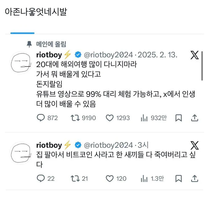 20대에 해외여행 많이 다니지 마라던 남자 근황 작성자 정보 최고관리자 작성일 02.06 21:12 컨텐츠 정보 3 조회 0 댓글 0 추천 0 비추천 목록 0 추천 추천 비추천 0 비추천 댓글 로그인한 회원만 댓글 등록이 가능합니다. 이전 다음 목록