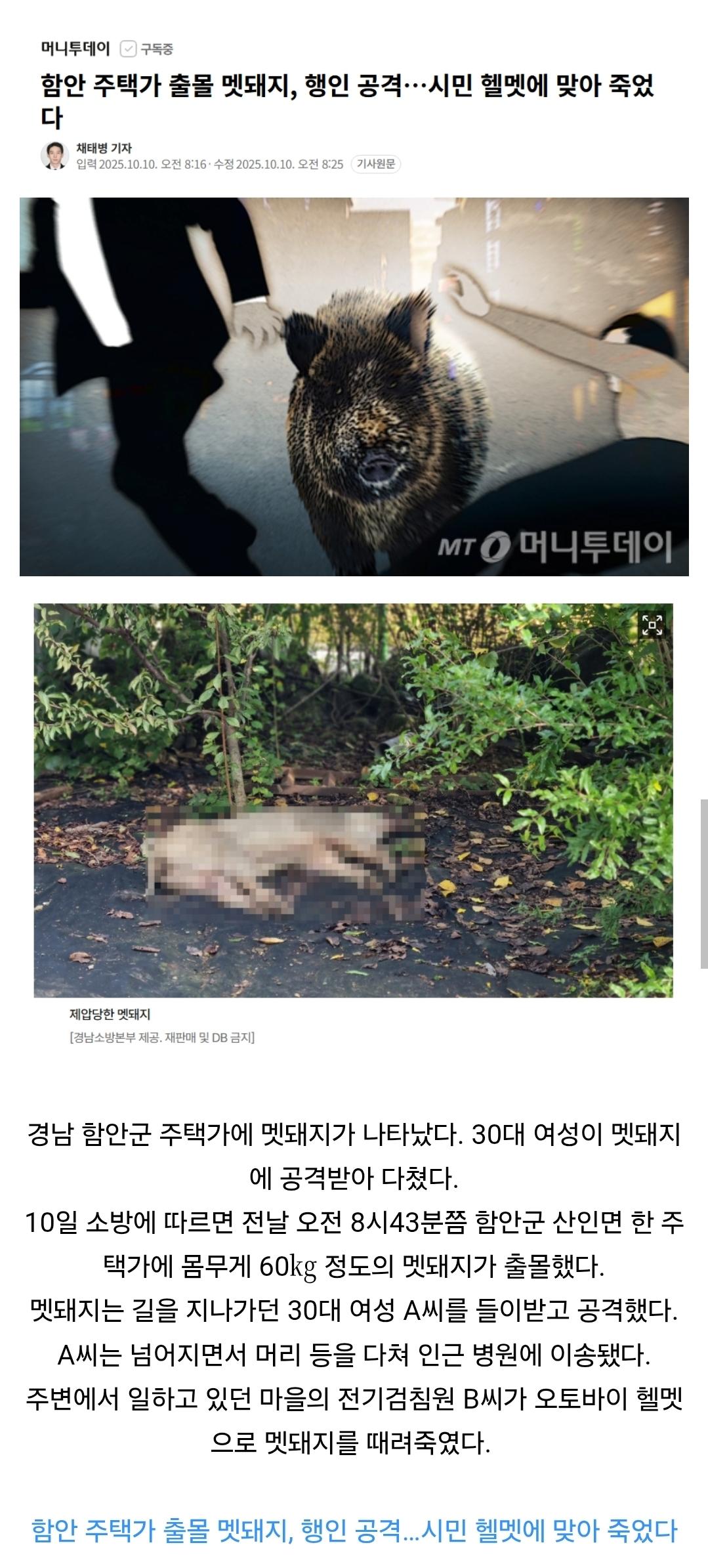 멧돼지...시민 헬멧에 맞아 죽었다 작성자 정보 최고관리자 작성일 10.10 18:48 컨텐츠 정보 27 조회 0 댓글 0 추천 0 비추천 목록 0 추천 추천 비추천 0 비추천 댓글 로그인한 회원만 댓글 등록이 가능합니다. 이전 다음 목록