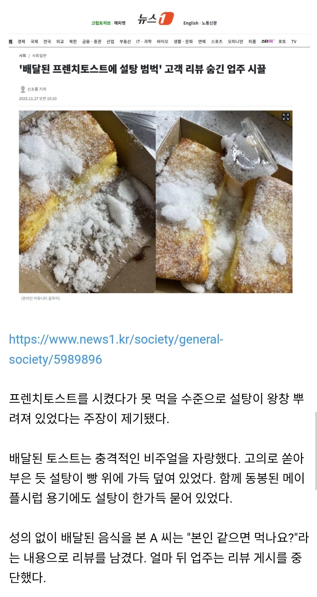 '배달된 프렌치토스트에 설탕 범벅' 고객 리뷰 숨긴 업주 시끌