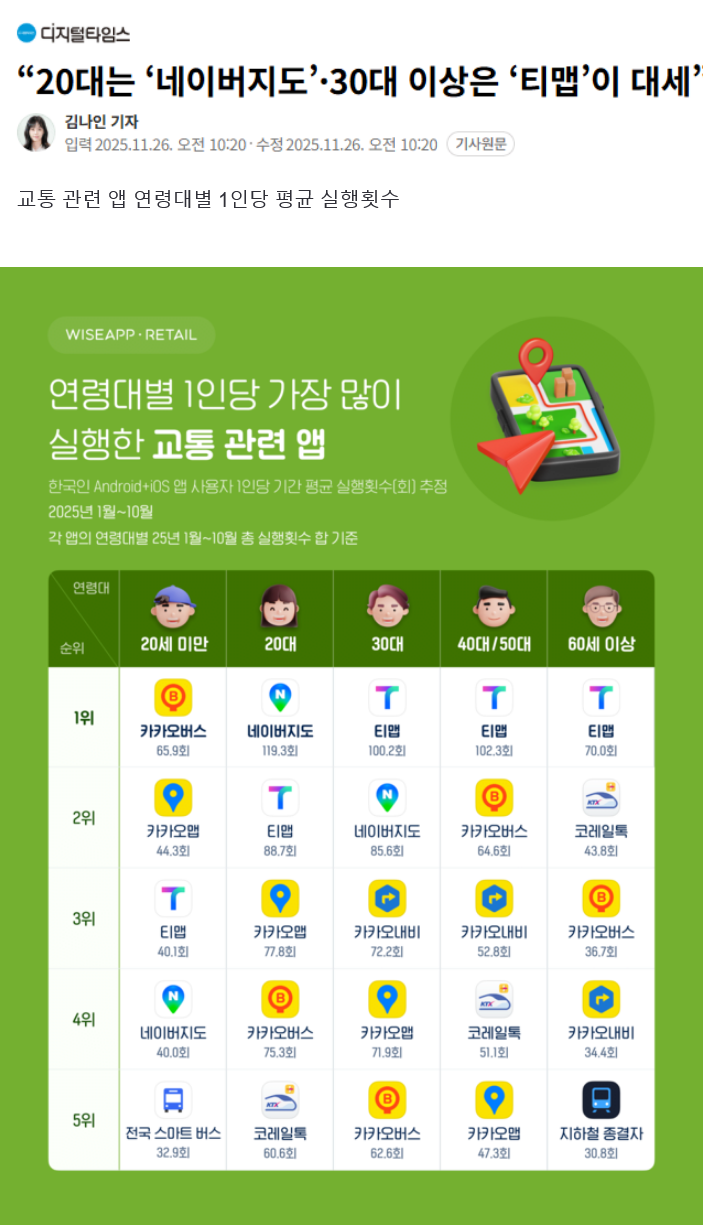 “20대는 ‘네이버지도’·30대 이상은 ‘티맵’이 대세”