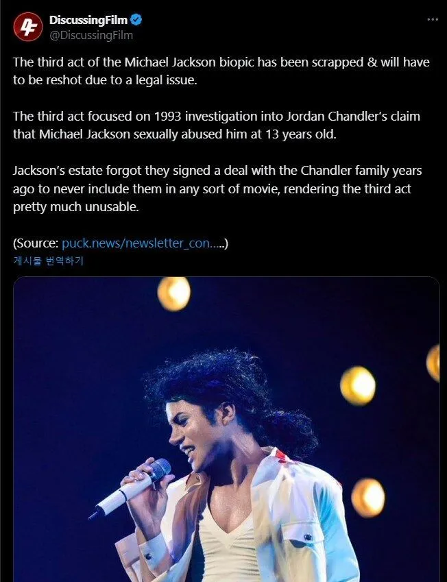 마이클잭슨 영화 일부 장면 폐기되버림 이게 어찌게 된거냐면 3막은 조던 챈들러가 13세 때 마이클 잭슨에게 성적 학대를 당했다고 우기는 1993년 사건을 중심으로 하고 있었음
