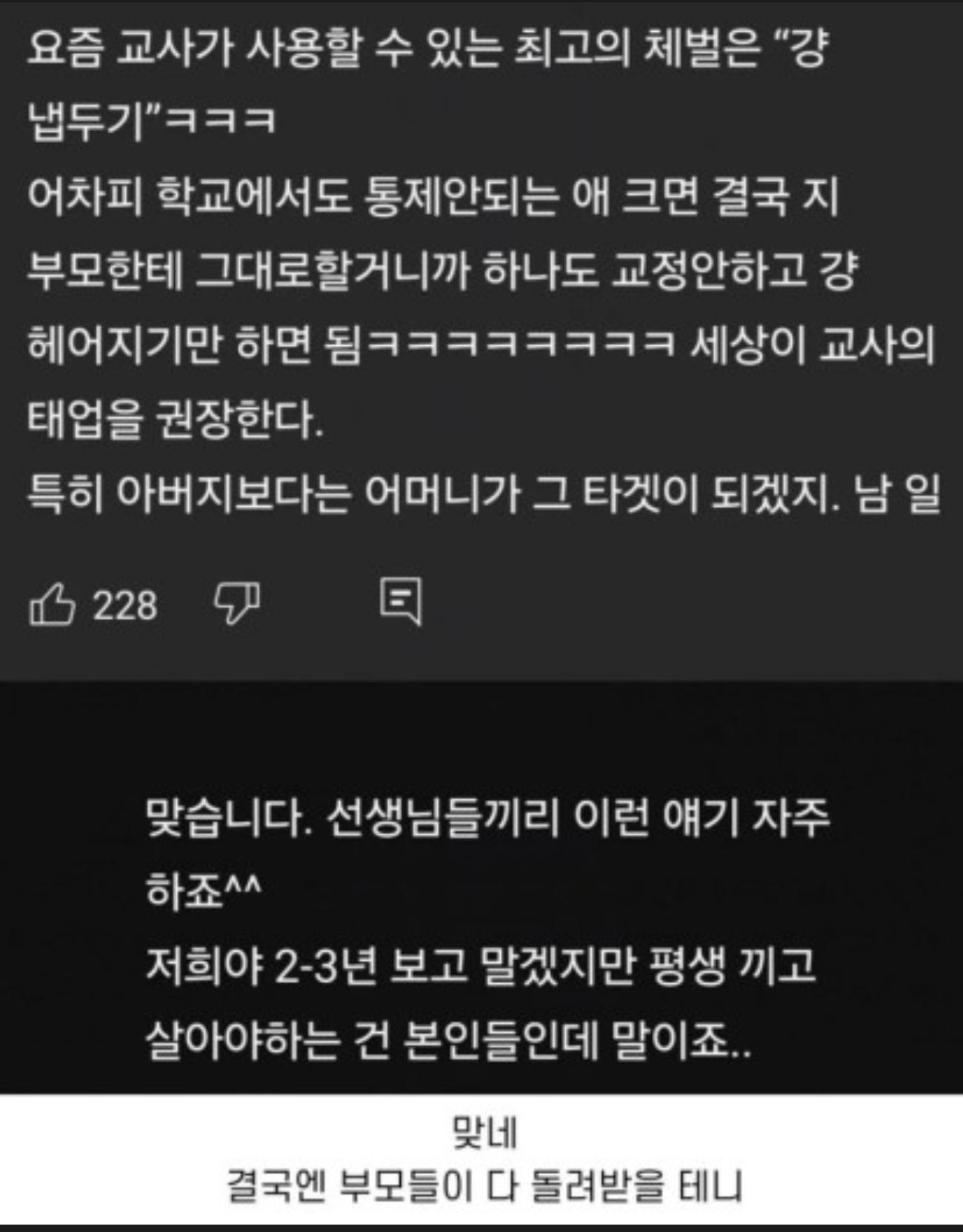 요즘 교사들이 할 수 있는 최고의 체벌. 작성자 정보 최고관리자 작성일 02.06 13:49 컨텐츠 정보 2 조회 0 댓글 0 추천 0 비추천 목록 0 추천 추천 비추천 0 비추천 댓글 로그인한 회원만 댓글 등록이 가능합니다. 이전 다음 목록