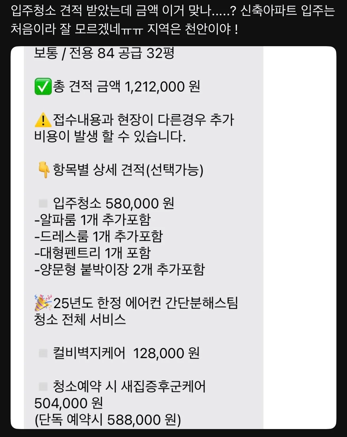 요즘 아파트 입주청소 비용 작성자 정보 최고관리자 작성일 2025.11.21 19:34 컨텐츠 정보 29 조회 0 댓글 0 추천 0 비추천 목록 0 추천 추천 비추천 0 비추천 댓글 로그인한 회원만 댓글 등록이 가능합니다. 이전 다음 목록