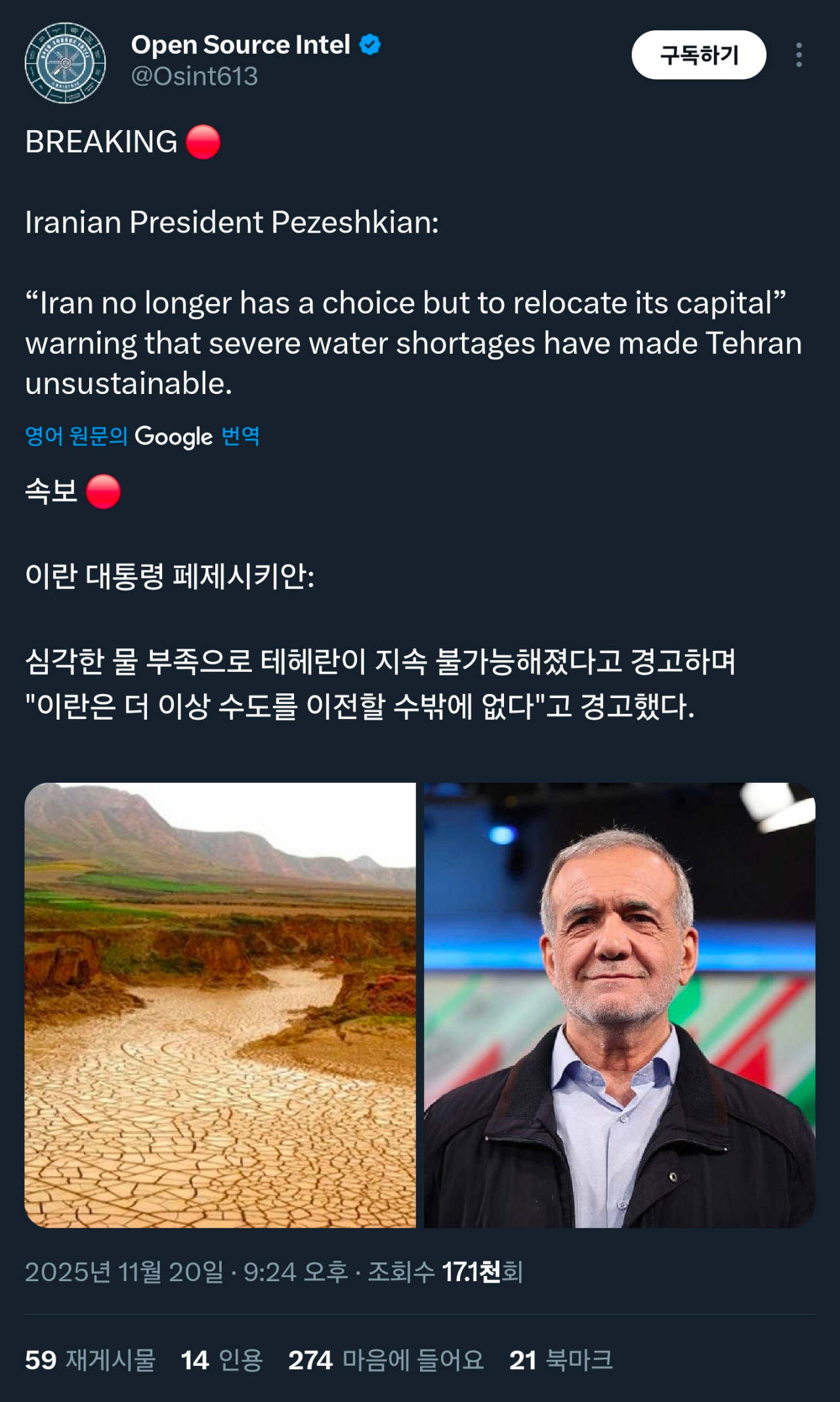 이란 대통령 : 이란의 수도를 옮길수 밖에 없다