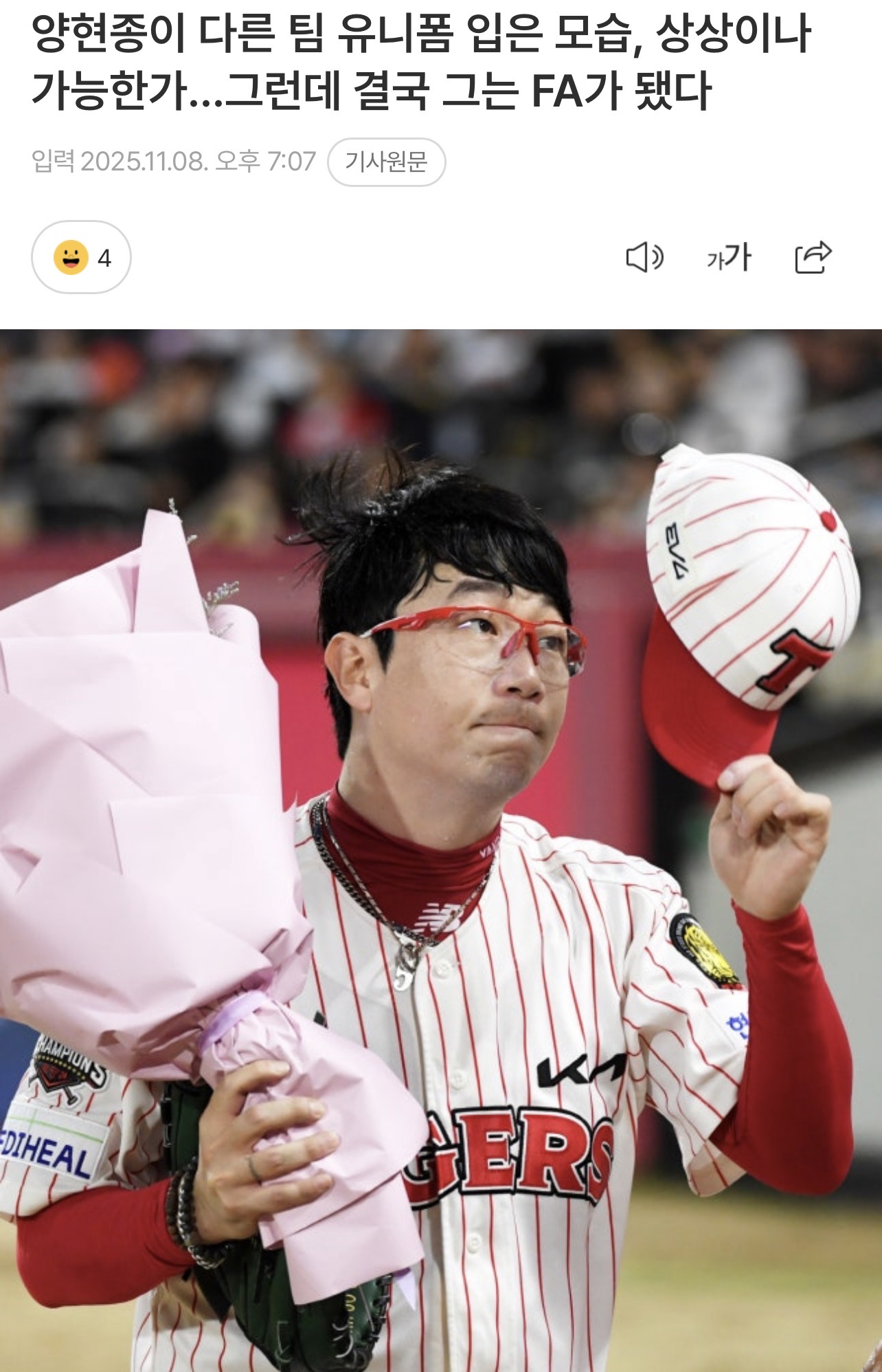 SSG 는 김광현에게 시즌중 비 FA 다년계약 (2년 36억) 해주며 사실상 은퇴까지 SSG 에서 할 수 있게 했는데 기아는 양현종을 그냥 FA 로 풀리게 했네요