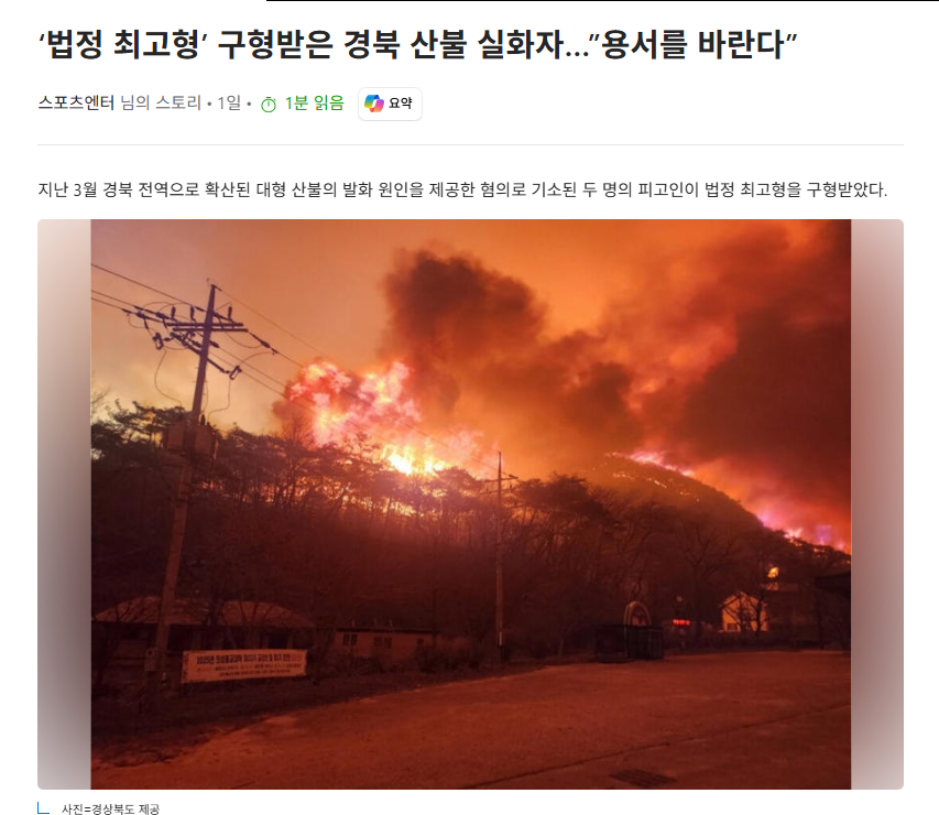 경북 산불 실화자, 법정 최고형 구형 작성자 정보 최고관리자 작성일 2025.11.07 16:05 컨텐츠 정보 36 조회 0 댓글 0 추천 0 비추천 목록 0 추천 추천 비추천 0 비추천 댓글 로그인한 회원만 댓글 등록이 가능합니다. 이전 다음 목록