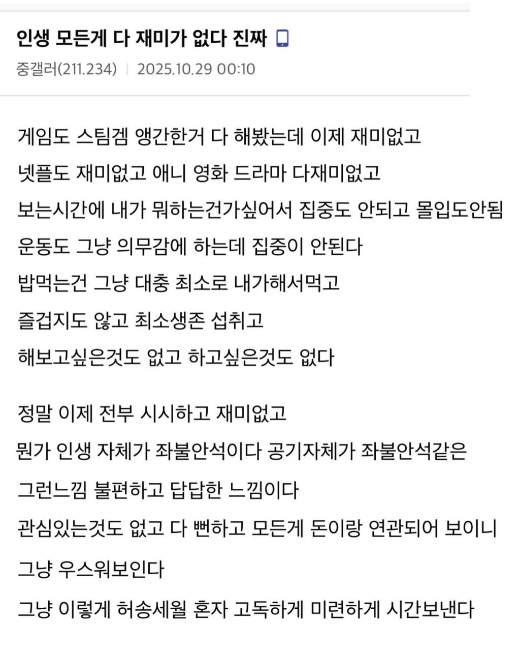 인생 모든게 다 재미없다 작성자 정보 최고관리자 작성일 2025.11.07 21:25 컨텐츠 정보 35 조회 0 댓글 0 추천 0 비추천 목록 0 추천 추천 비추천 0 비추천 댓글 로그인한 회원만 댓글 등록이 가능합니다. 이전 다음 목록