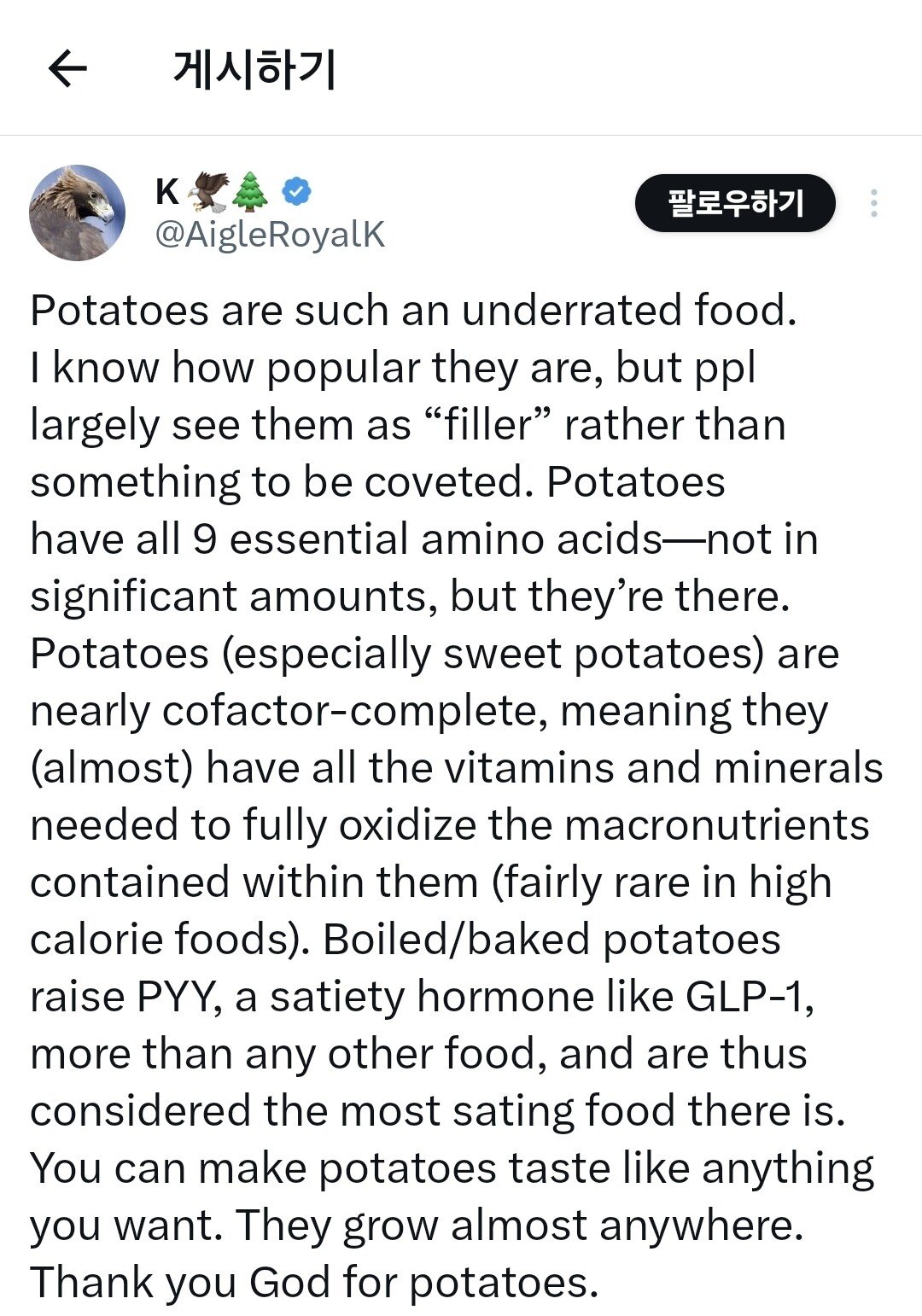지구상에 존재하는 음식중 가장 포만감주는 음식 작성자 정보 최고관리자 작성일 2025.11.05 00:25 컨텐츠 정보 38 조회 0 댓글 0 추천 0 비추천 목록 9가지 필수 아미노산이 모두 들어있고 감자는 다량의 영양소를 완전히 산화하는데 필요한 모든 비타민과 미네랄을 함유하고 있다고삶거나 구운 감자는 포만감 호르몬인 PYY를 다른 어떤 음식보다 많이 증가시켜 가장 포만감을 주는 음식이라고 함 단 조리법에 따라 포만감차이가 큰데 삶은 감자 > 찐 감자 > 구운 감자 > 튀긴 감자(감자튀김) 순이라고 함 0 추천 추천 비추천 0 비추천 댓글 로그인한 회원만 댓글 등록이 가능합니다. 이전 다음 목록