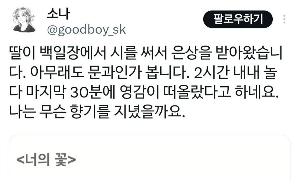 고1 딸이 백일장에서 은상받은 시 작성자 정보 최고관리자 작성일 2025.12.29 00:44 컨텐츠 정보 5 조회 0 댓글 0 추천 0 비추천 목록 0 추천 추천 비추천 0 비추천 댓글 로그인한 회원만 댓글 등록이 가능합니다. 이전 다음 목록
