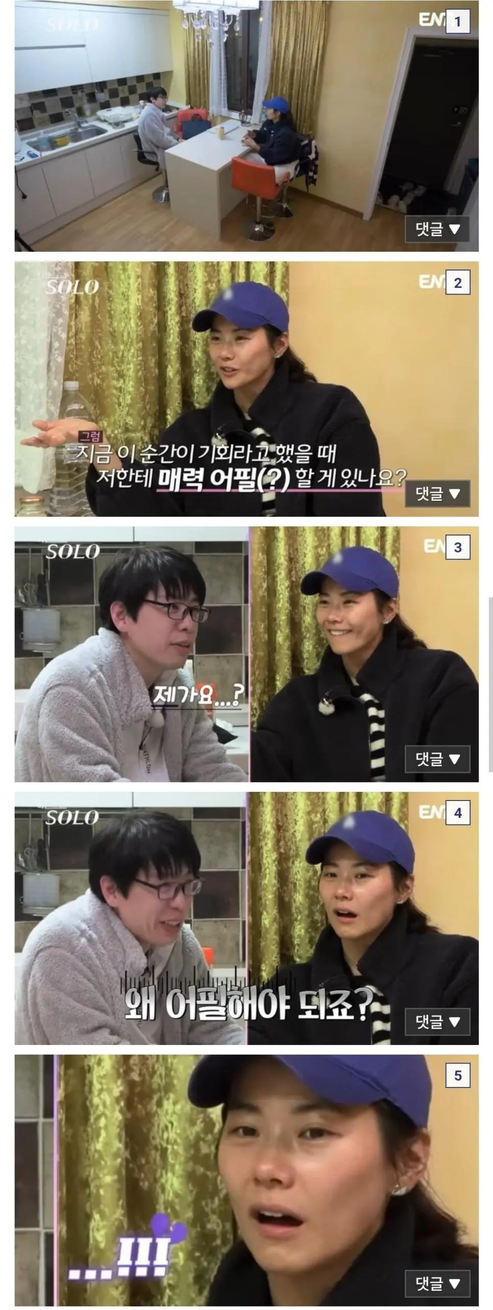 나는 솔로 돌싱편 명장면 작성자 정보 최고관리자 작성일 2025.10.31 16:13 컨텐츠 정보 48 조회 0 댓글 0 추천 0 비추천 목록 저거 전 상황이 여자가 남자한테 먼저 나가서 대화하자고 들이대고는 저러는 상황. 세상 모든 남자들이 자기에게 호감은 있으나 표현을 못 하고 있는 거라고 생각하는 어마어마한 공주병.. 20대 초반이 그러면 귀엽게라도 봐주는데 한번 갔다오신 40살이 이러시면 곤란하다고 봄. 0 추천 추천 비추천 0 비추천 댓글 로그인한 회원만 댓글 등록이 가능합니다. 이전 다음 목록