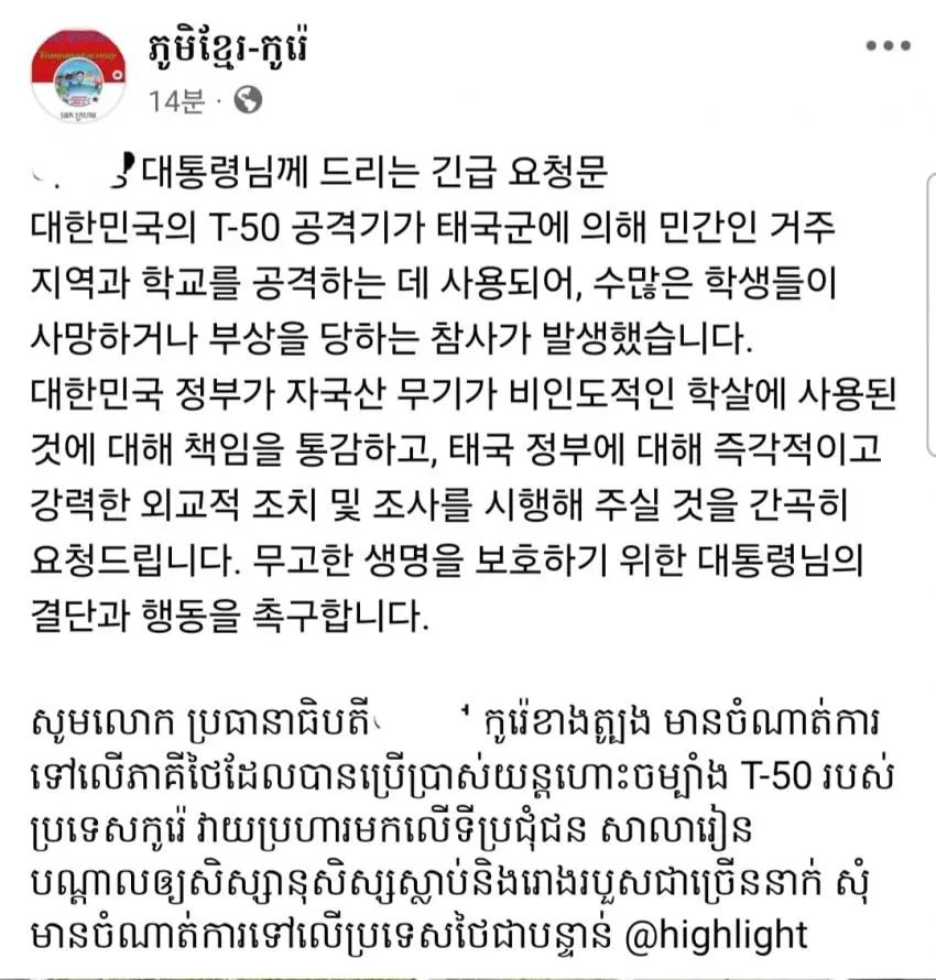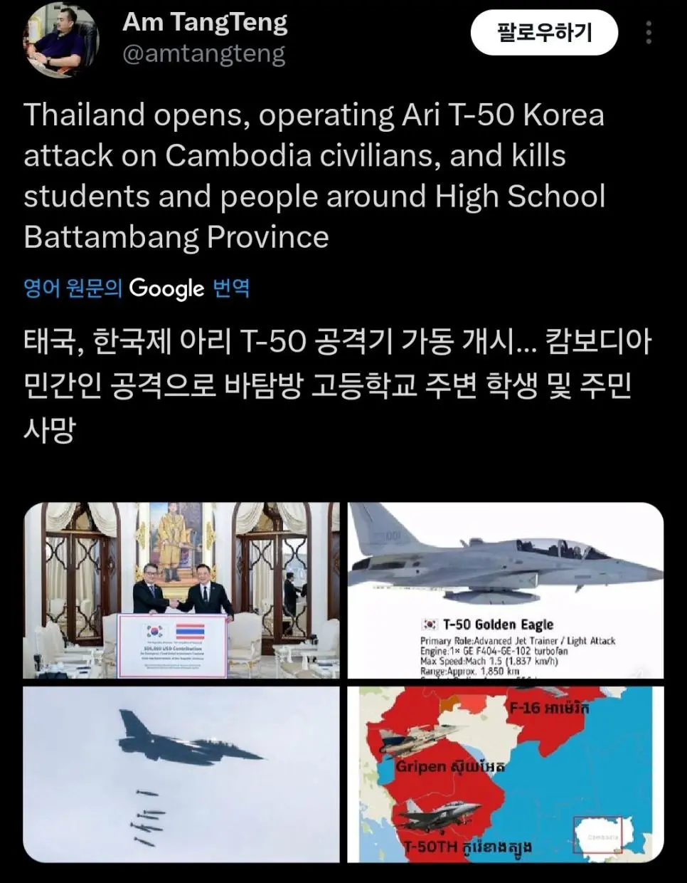 캄보디아 '태국과의 전쟁에 한국도 책임있다' 작성자 정보 최고관리자 작성일 2025.12.28 13:21 컨텐츠 정보 10 조회 0 댓글 0 추천 0 비추천 목록 저기 한국 태국 높으신분들 악수하는 사진은 무기공급 협약식이 아니라,태국 수해 지원금을 주는 장면이다. 보이스피싱의 나라답게 주작밖에 못하는...이미 사간 물건인데 우리가 뭐 어쩌라고?? 0 추천 추천 비추천 0 비추천 댓글 로그인한 회원만 댓글 등록이 가능합니다. 이전 다음 목록