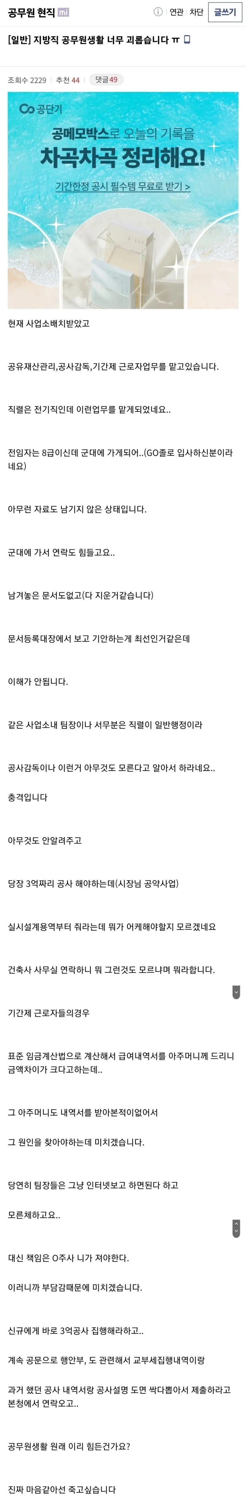 공무원 생활이 너무 괴롭습니다 작성자 정보 최고관리자 작성일 2025.10.30 01:07 컨텐츠 정보 51 조회 0 댓글 0 추천 0 비추천 목록 0 추천 추천 비추천 0 비추천 댓글 로그인한 회원만 댓글 등록이 가능합니다. 이전 다음 목록
