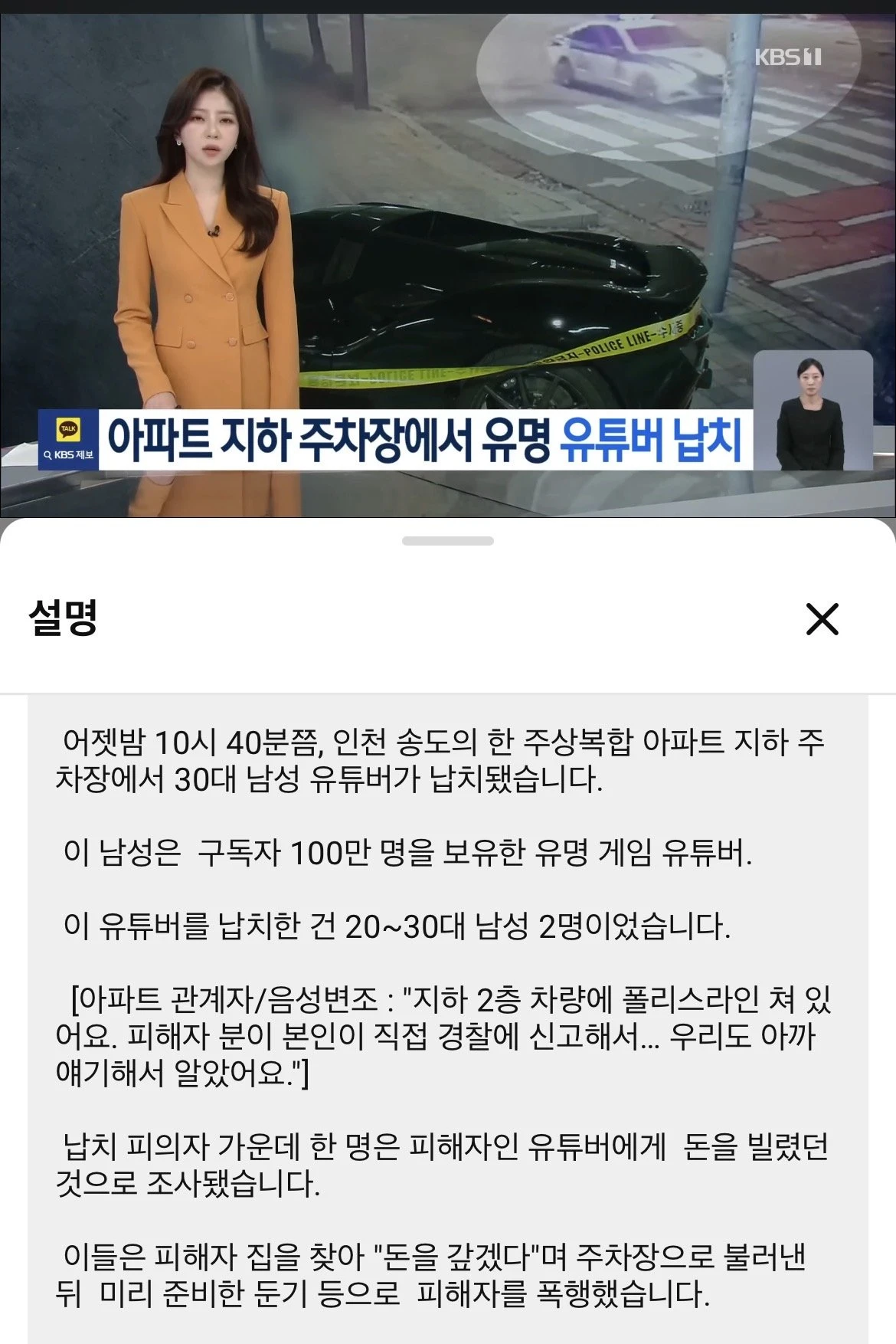 지하주차장에서 100만 유투버 납치 작성자 정보 최고관리자 작성일 2025.10.28 19:13 컨텐츠 정보 44 조회 0 댓글 0 추천 0 비추천 목록 유튜버가 돈을 빌렸는데 안갚아서 받아낼라고 납치한게 아니라 피의자가 피해자인 유튜버한테 돈을 빌려놓고 안갚으려고 납치. 인천 송도. 30대. 차종. 구독자수 98만(약 100만). 게임 유튜버 수탉으로 추정. 0 추천 추천 비추천 0 비추천 댓글 로그인한 회원만 댓글 등록이 가능합니다. 이전 다음 목록