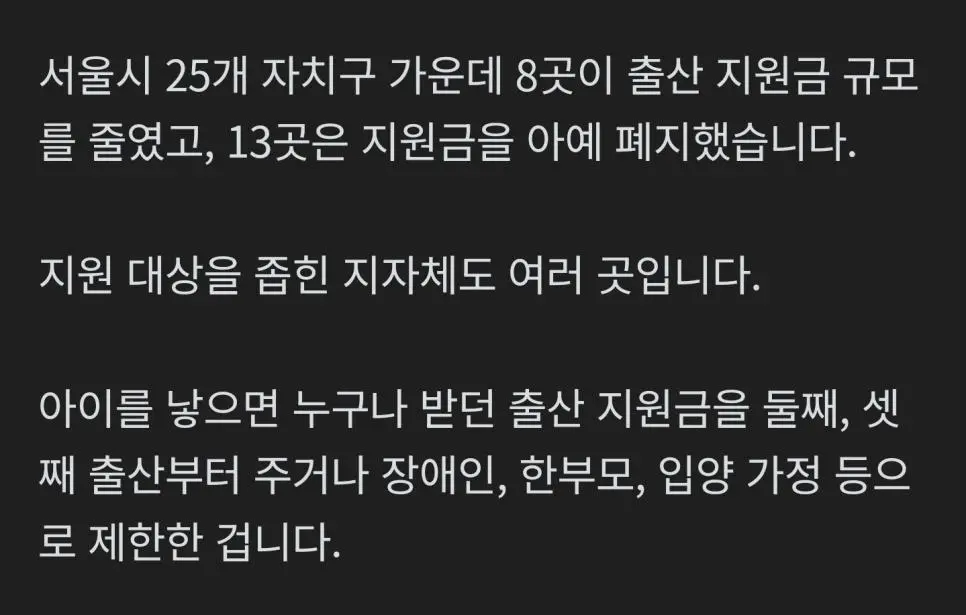 서울시 출산지원금 폐지중 작성자 정보 최고관리자 작성일 2025.12.27 09:49 컨텐츠 정보 10 조회 0 댓글 0 추천 0 비추천 목록 0 추천 추천 비추천 0 비추천 댓글 로그인한 회원만 댓글 등록이 가능합니다. 이전 다음 목록