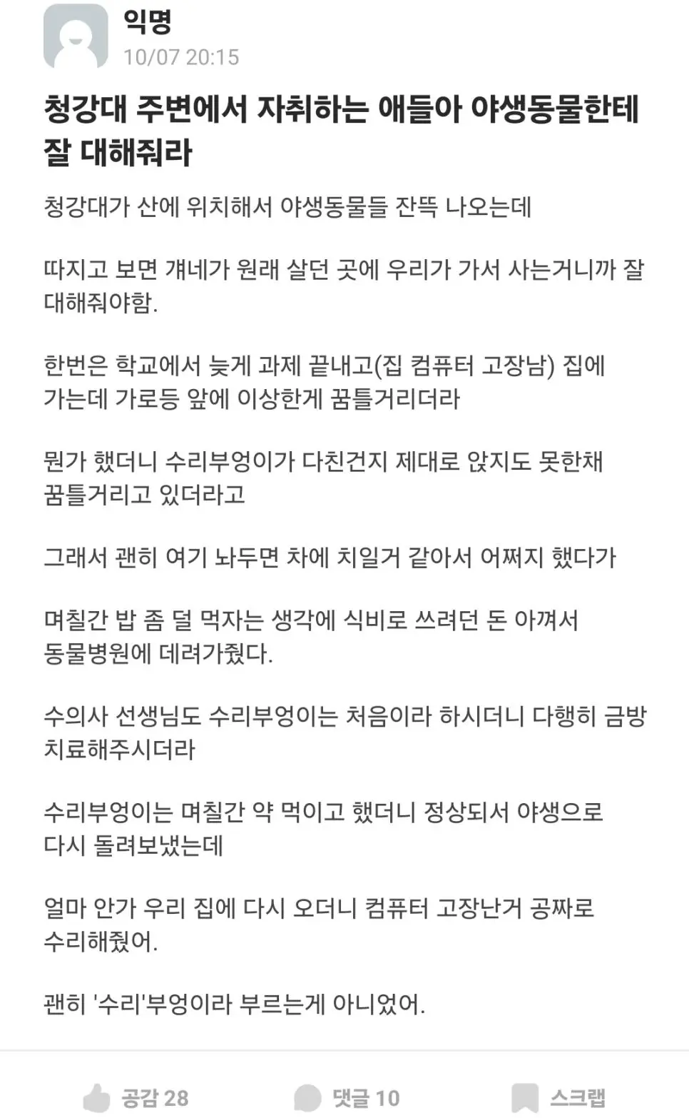 수리부엉이를 살려준 대학생 작성자 정보 최고관리자 작성일 2025.10.24 00:24 컨텐츠 정보 51 조회 0 댓글 0 추천 0 비추천 목록 0 추천 추천 비추천 0 비추천 댓글 로그인한 회원만 댓글 등록이 가능합니다. 이전 다음 목록
