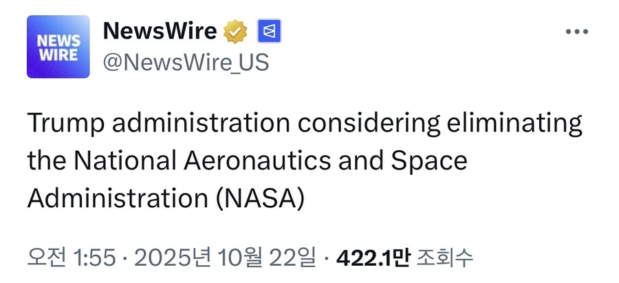 트럼프 “NASA 해체” 작성자 정보 최고관리자 작성일 2025.10.23 07:50 컨텐츠 정보 40 조회 0 댓글 0 추천 0 비추천 목록 ??? 0 추천 추천 비추천 0 비추천 댓글 로그인한 회원만 댓글 등록이 가능합니다. 이전 다음 목록