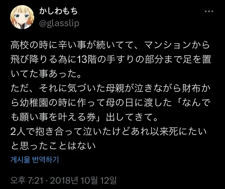 벼랑 끝에 선 자식에게 엄마가 꺼낸 것 작성자 정보 최고관리자 작성일 02.02 15:34 컨텐츠 정보 5 조회 0 댓글 0 추천 0 비추천 목록 고등학교 때 힘든 일이 계속돼서 아파트에서 뛰어내리려고 13층 난간까지 발을 올렸던 적이 있었어. 근데 그걸 눈치챈 엄마가 울면서 지갑에서 뭔가를 꺼내셨는데 내가 유치원 때 만들어서 어머니의 날에 드렸던 「무엇이든 소원을 들어주는 쿠폰」인 거야. 둘이서 서로 껴안고 울었고 그 이후로는 죽고 싶다고 생각한 적은 없어 0 추천 추천 비추천 0 비추천 댓글 로그인한 회원만 댓글 등록이 가능합니다. 이전 다음 목록