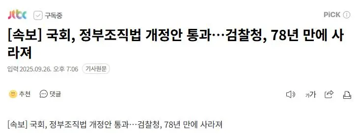 78년만에 '검찰청 폐지' 본회의 통과 작성자 정보 최고관리자 작성일 2025.12.24 15:37 컨텐츠 정보 16 조회 0 댓글 0 추천 0 비추천 목록 0 추천 추천 비추천 0 비추천 댓글 로그인한 회원만 댓글 등록이 가능합니다. 이전 다음 목록