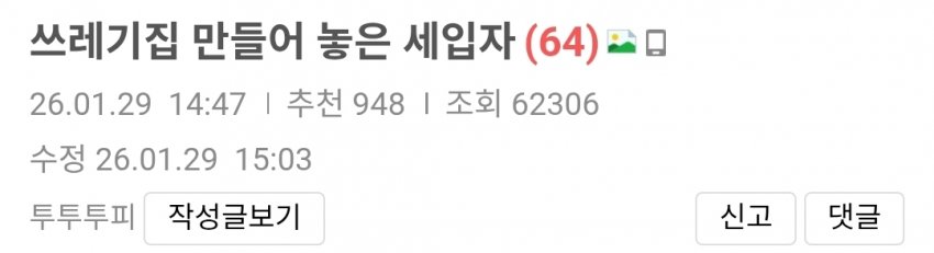쓰레기집 만들어 놓은 세입자 논란 작성자 정보 최고관리자 작성일 02.02 15:21 컨텐츠 정보 5 조회 0 댓글 0 추천 0 비추천 목록 0 추천 추천 비추천 0 비추천 댓글 로그인한 회원만 댓글 등록이 가능합니다. 이전 다음 목록