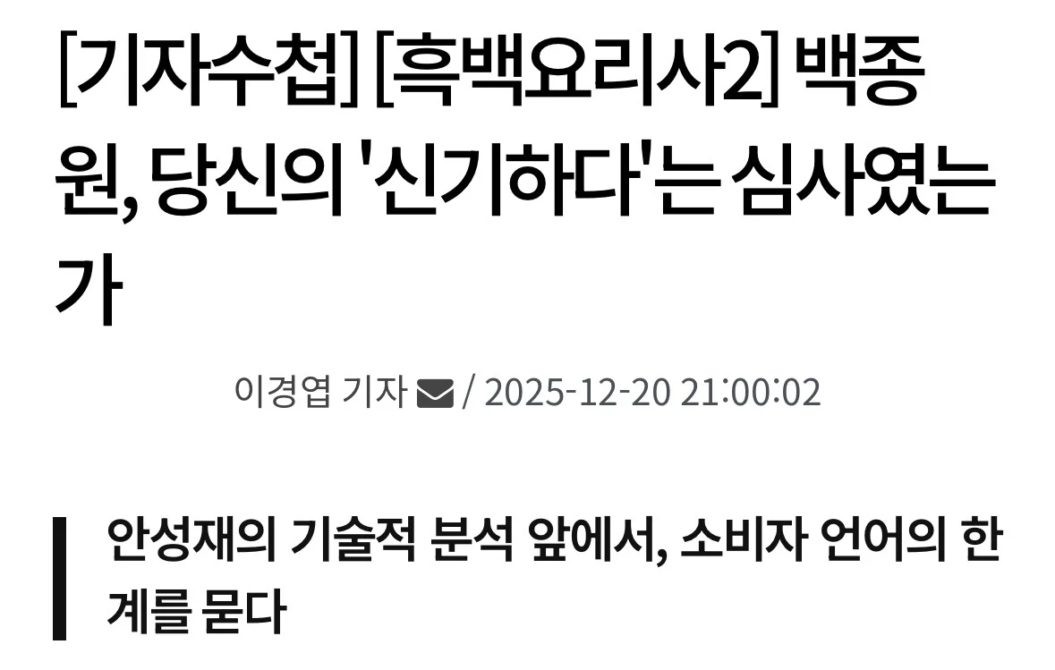 백종원 당신의 ‘신기하다’는 심사였는가? 작성자 정보 최고관리자 작성일 2025.12.21 18:35 컨텐츠 정보 12 조회 0 댓글 0 추천 0 비추천 목록 0 추천 추천 비추천 0 비추천 댓글 로그인한 회원만 댓글 등록이 가능합니다. 이전 다음 목록