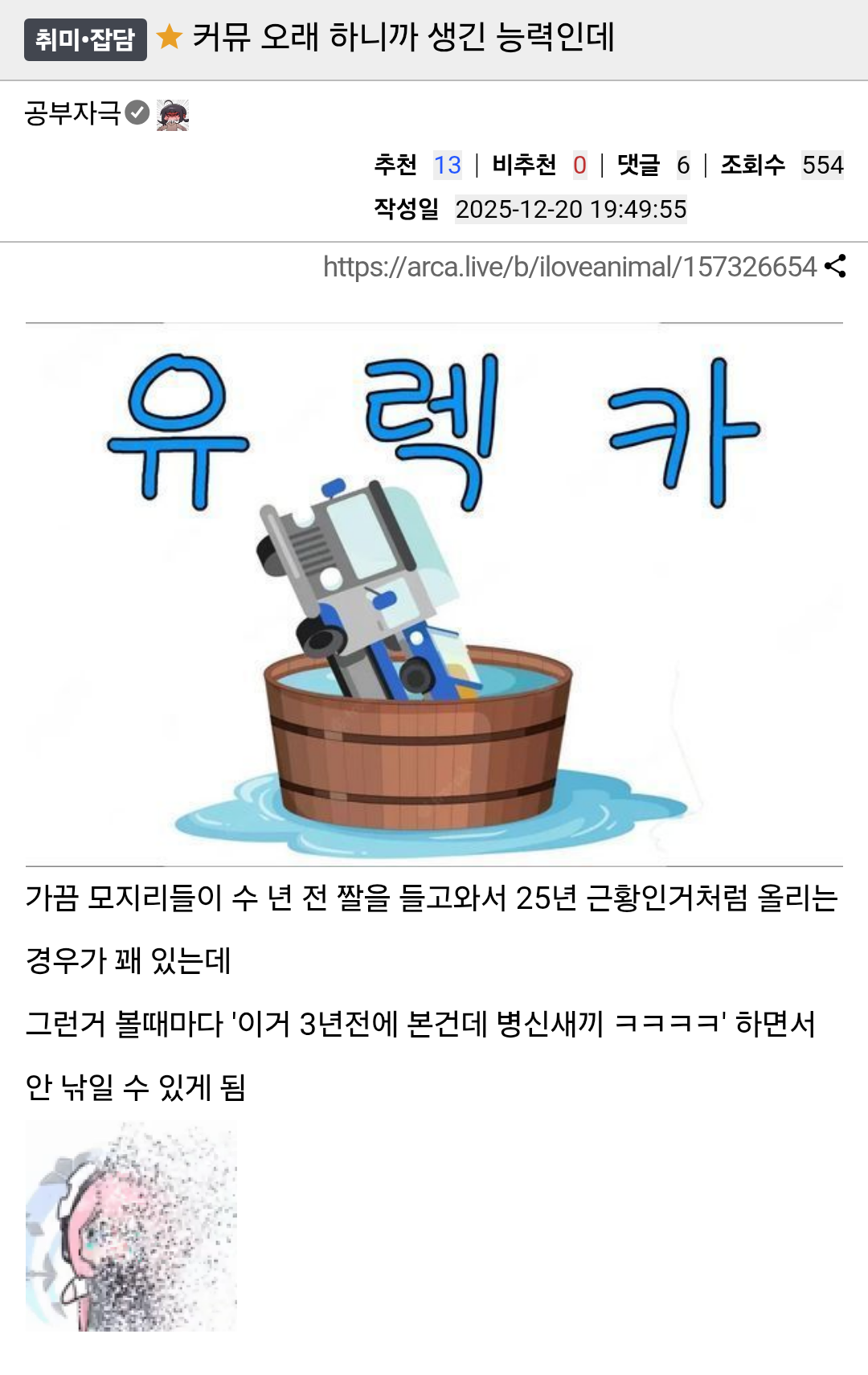 커뮤 오래하면 생기는 능력 작성자 정보 최고관리자 작성일 2025.12.21 13:00 컨텐츠 정보 12 조회 0 댓글 0 추천 0 비추천 목록 0 추천 추천 비추천 0 비추천 댓글 로그인한 회원만 댓글 등록이 가능합니다. 이전 다음 목록