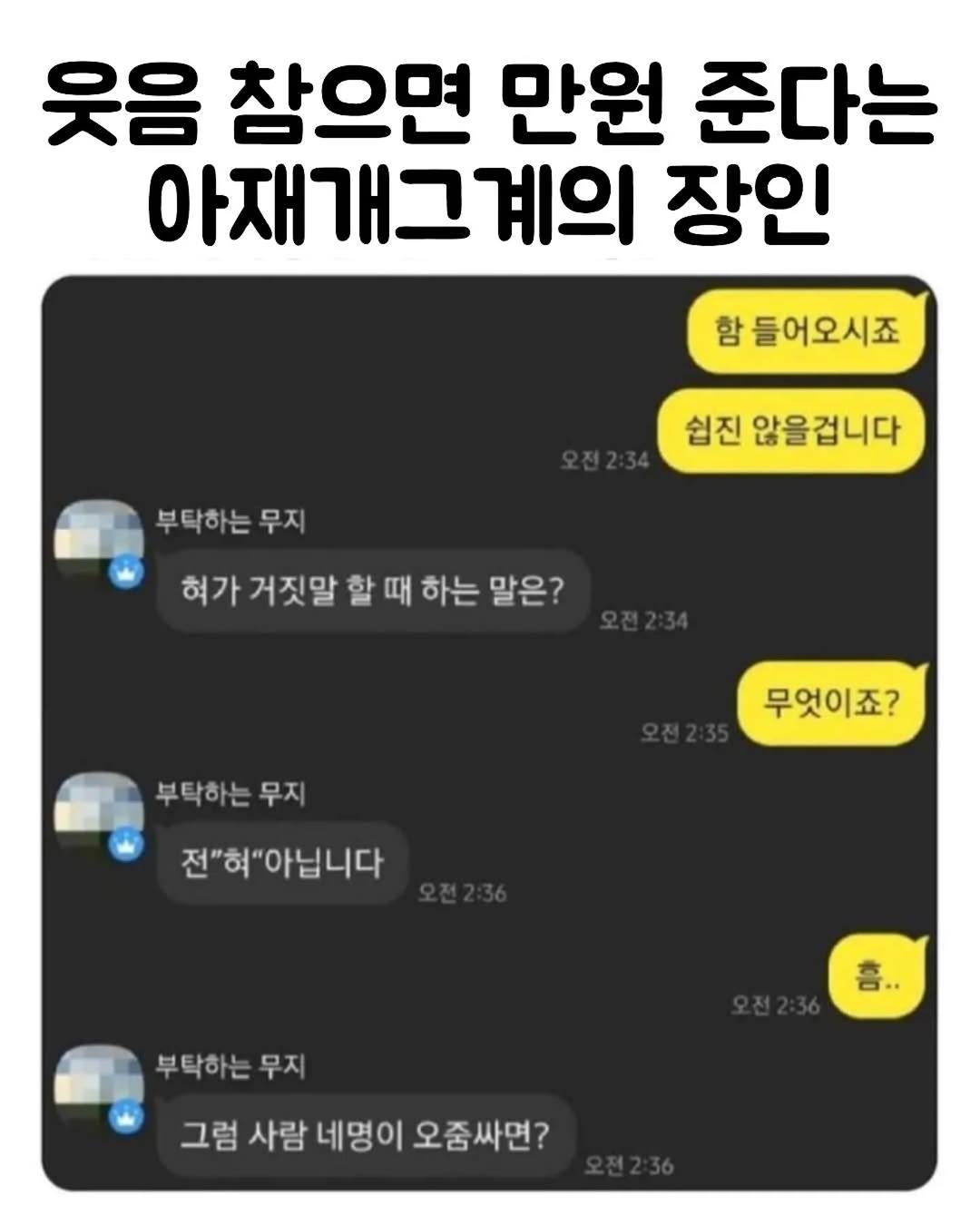 장인이 말아주는 아재개그 작성자 정보 최고관리자 작성일 2025.12.20 10:58 컨텐츠 정보 13 조회 0 댓글 0 추천 0 비추천 목록 0 추천 추천 비추천 0 비추천 댓글 로그인한 회원만 댓글 등록이 가능합니다. 이전 다음 목록