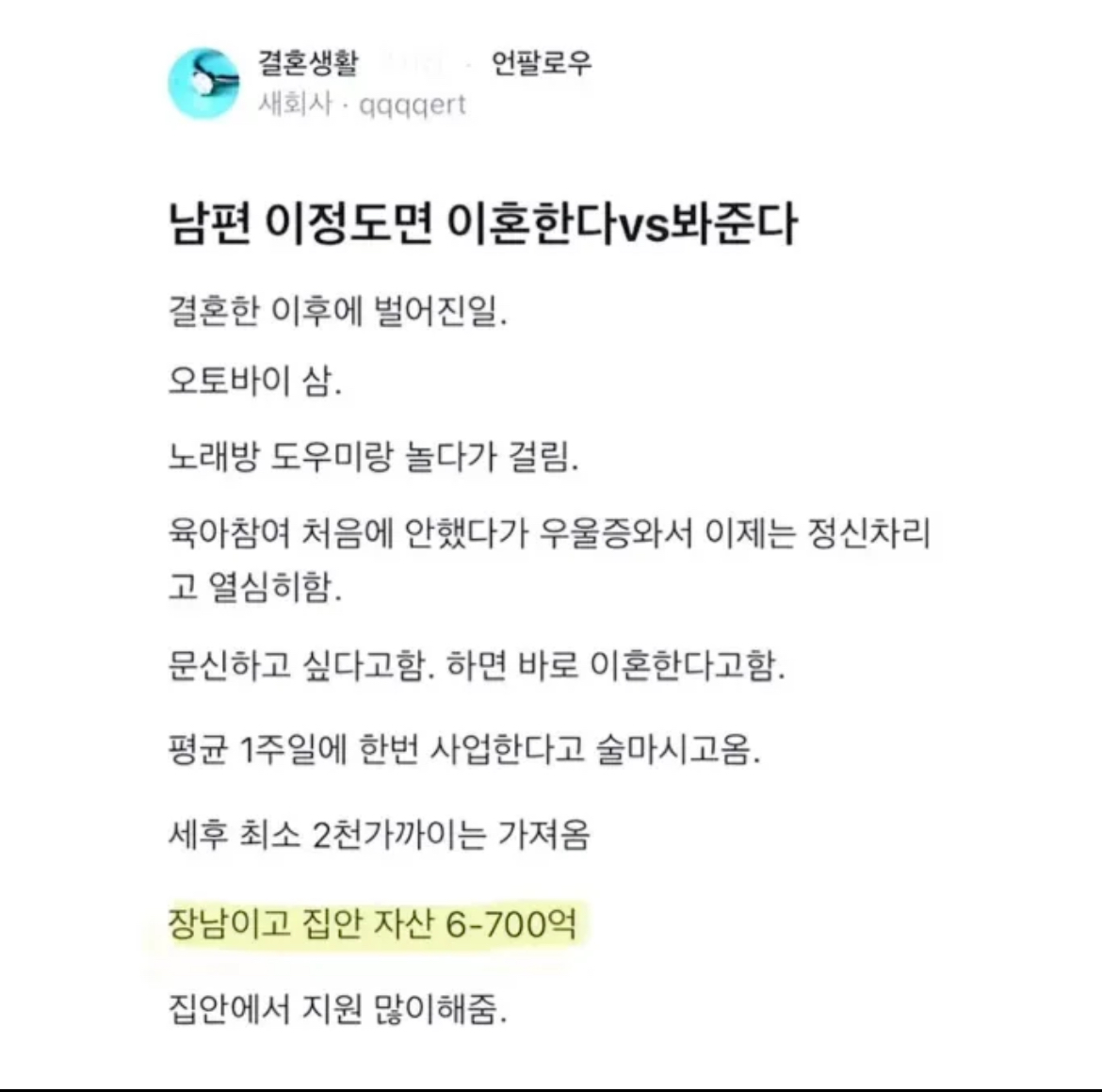 남편이 이정도면 이혼한다 vs 봐준다 작성자 정보 최고관리자 작성일 2025.12.19 10:40 컨텐츠 정보 28 조회 0 댓글 0 추천 0 비추천 목록 0 추천 추천 비추천 0 비추천 댓글 로그인한 회원만 댓글 등록이 가능합니다. 이전 다음 목록