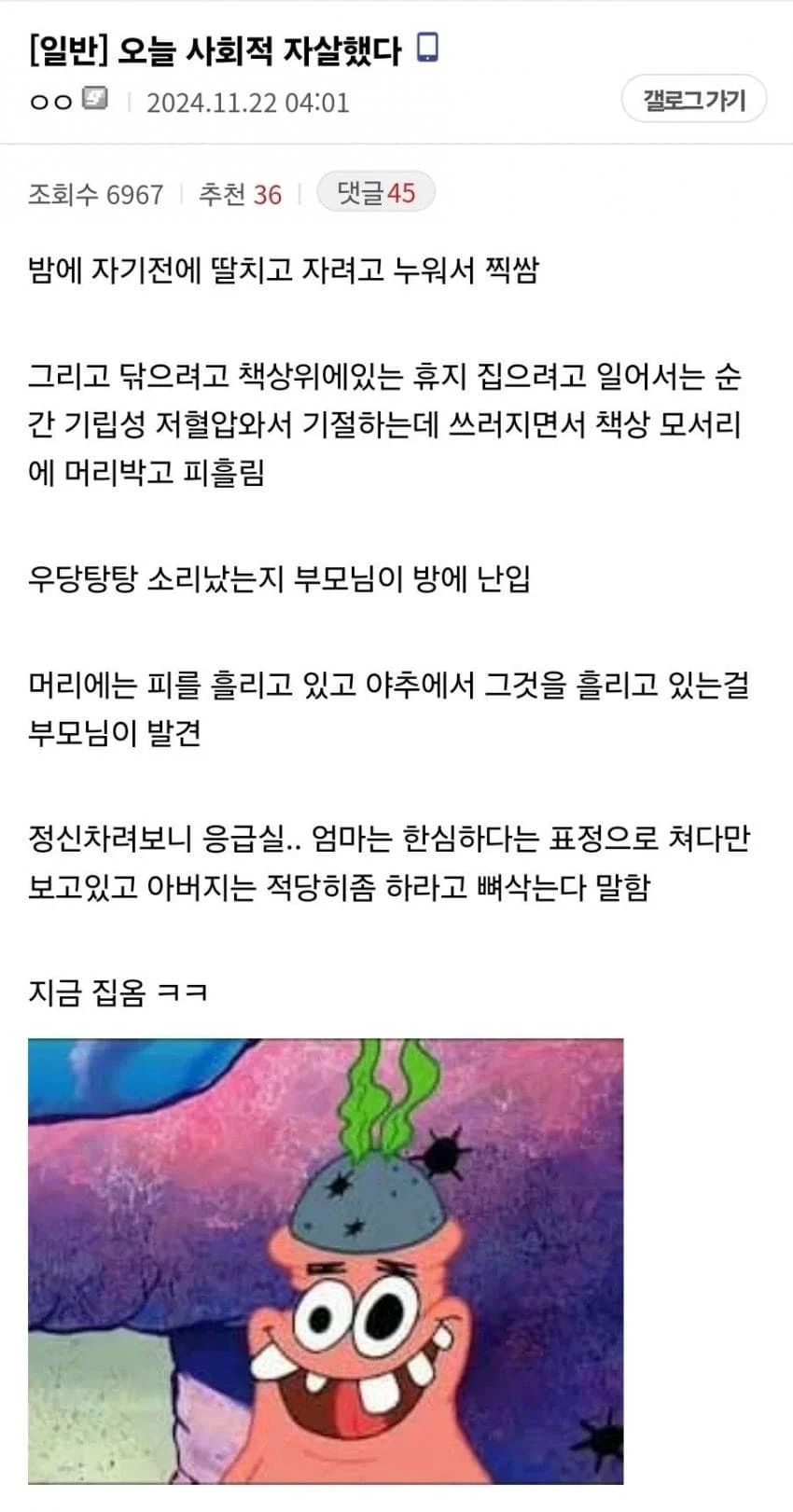 오늘 사회적 자살했다 작성자 정보 최고관리자 작성일 2025.12.17 09:09 컨텐츠 정보 11 조회 0 댓글 0 추천 0 비추천 목록 0 추천 추천 비추천 0 비추천 댓글 로그인한 회원만 댓글 등록이 가능합니다. 이전 다음 목록