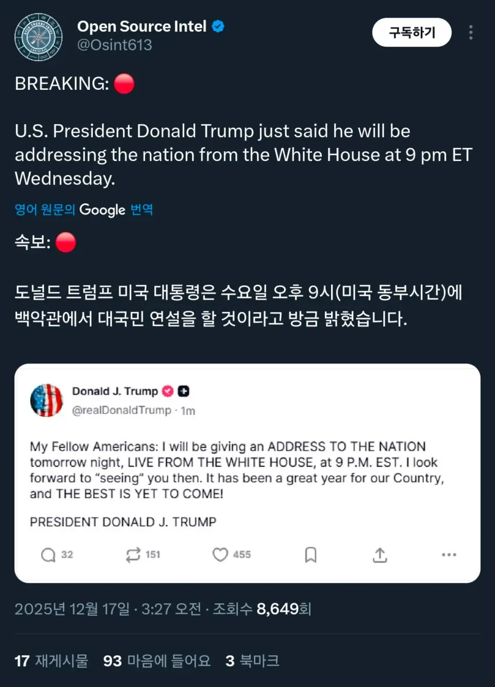 도널드 트럼프, 오후 9시 대국민 연설 예정 작성자 정보 최고관리자 작성일 2025.12.17 07:19 컨텐츠 정보 12 조회 0 댓글 0 추천 0 비추천 목록 워싱턴 D.C 시간으로 오후 9시니까...한국 시간으로 오전 10시네요. 0 추천 추천 비추천 0 비추천 댓글 로그인한 회원만 댓글 등록이 가능합니다. 이전 다음 목록