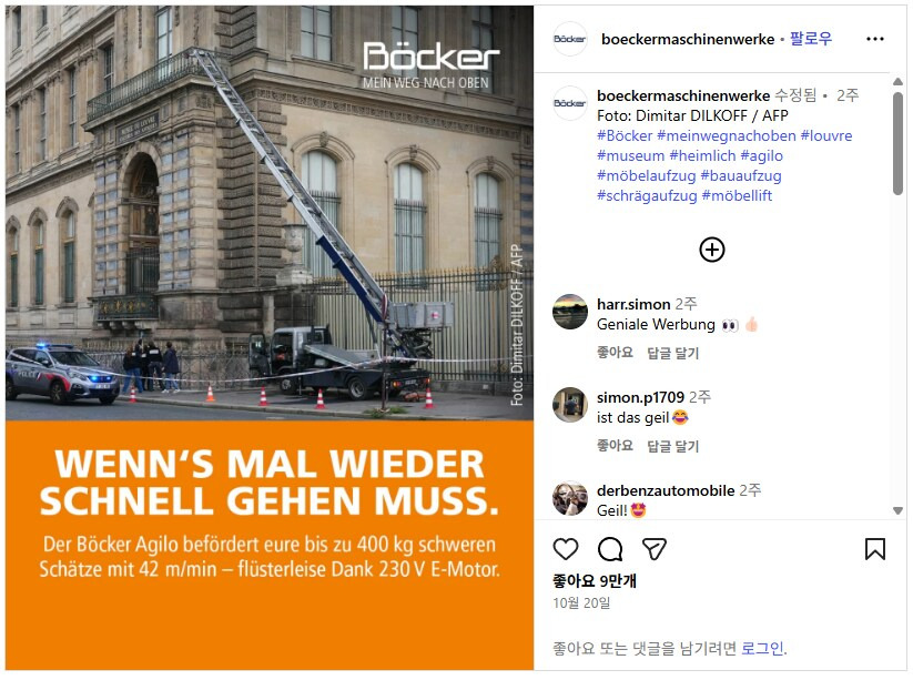 루브르 도난 사건 때 범인들이 사용한 사다리차 회사 근황 작성자 정보 최고관리자 작성일 11.11 15:45 컨텐츠 정보 5 조회 0 댓글 0 추천 0 비추천 목록 참고로 독일 회사다 0 추천 추천 비추천 0 비추천 댓글 로그인한 회원만 댓글 등록이 가능합니다. 이전 다음 목록