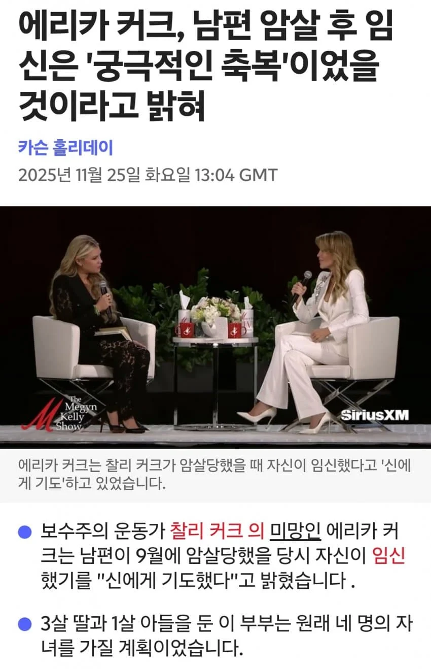 찰리 커크 마누라 "남편 암살 후 임신은 축복이었다"