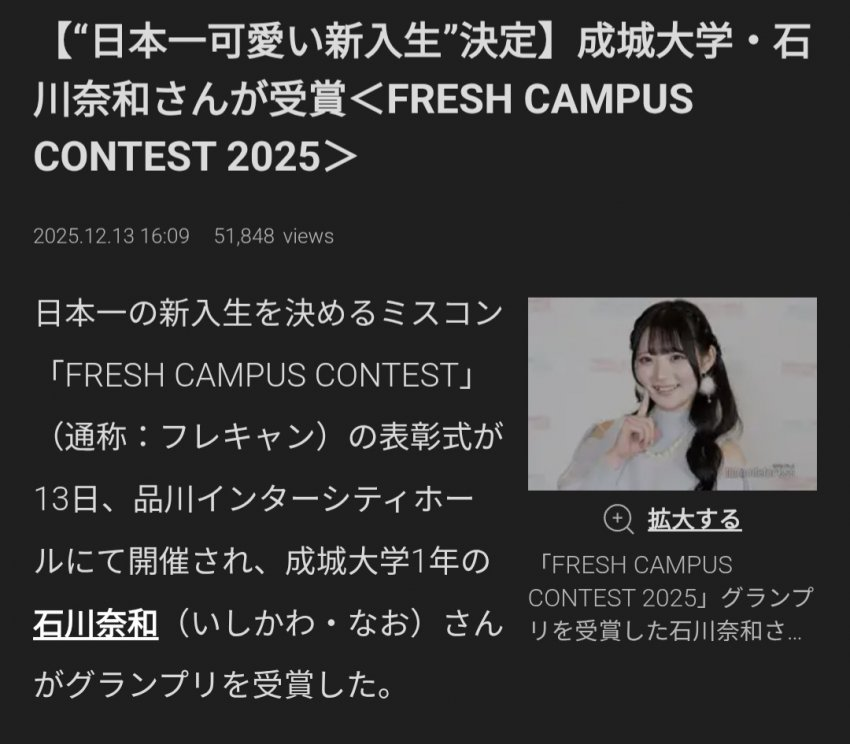 일본에서 가장 귀여운 여대생 대회 우승자 작성자 정보 최고관리자 작성일 2025.12.15 11:16 컨텐츠 정보 16 조회 0 댓글 0 추천 0 비추천 목록 최우수상 도쿄 세타가야구 소재 세이조 대학 재학 이시카와 나오(20) 상금 100만엔 0 추천 추천 비추천 0 비추천 댓글 로그인한 회원만 댓글 등록이 가능합니다. 이전 다음 목록