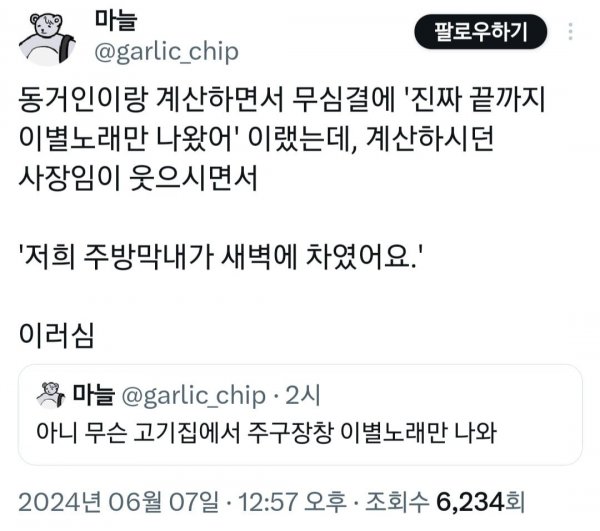 고깃집에서 이별 노래만 틀어준 이유 작성자 정보 최고관리자 작성일 2025.12.14 14:00 컨텐츠 정보 15 조회 0 댓글 0 추천 0 비추천 목록 0 추천 추천 비추천 0 비추천 댓글 로그인한 회원만 댓글 등록이 가능합니다. 이전 다음 목록