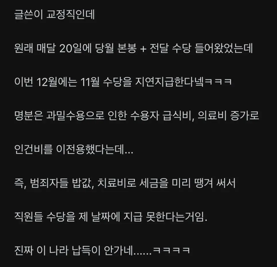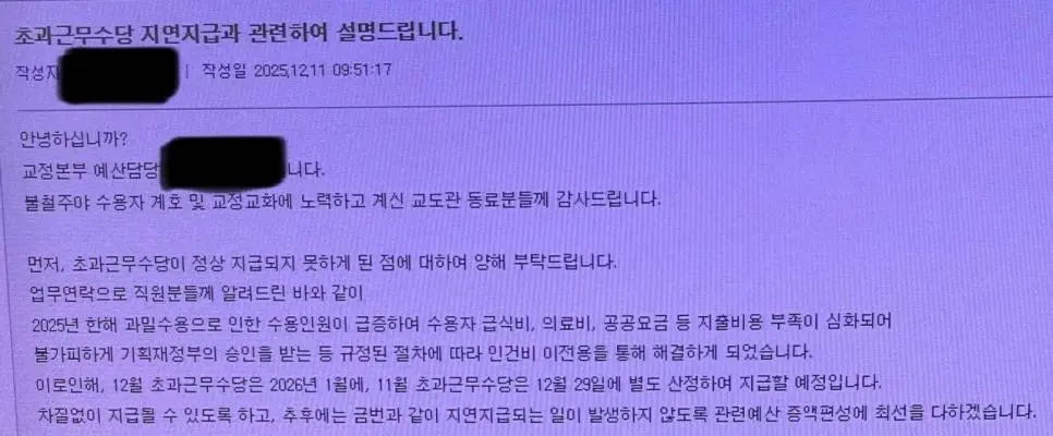 교정직 근무원 임금체불 작성자 정보 최고관리자 작성일 2025.12.13 19:42 컨텐츠 정보 16 조회 0 댓글 0 추천 0 비추천 목록 수용자 증가로 예산 부족해교정공무원들 인건비 전용해서 해결하고교정공무원들 11월 초과근무수당 9일 지연지급12월 초과수당은 1월에 지급(원칙대로면 회계독립원칙에 따라 연말 지급분은 무조건 연내 지급)ㅡㅡㅡㅡㅡㄷㄷ 0 추천 추천 비추천 0 비추천 댓글 로그인한 회원만 댓글 등록이 가능합니다. 이전 다음 목록