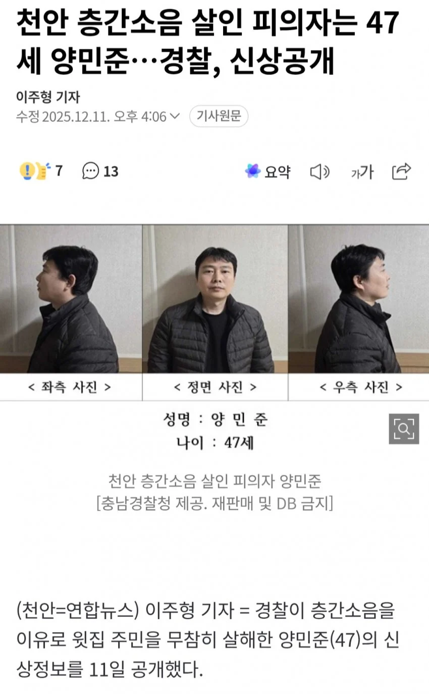 천안 층간소음 살인사건 범인 신상공개 작성자 정보 최고관리자 작성일 2025.12.11 17:40 컨텐츠 정보 15 조회 0 댓글 0 추천 0 비추천 목록 범인 양만준은 70대 이웃주민을 야외에서 흉기를 찌르고 관리사무소로 피해자가 대피하자 자신의 K3 승용차를 이용 관리사무소에 차량을 돌진하여 문을 부순 뒤 사무소 안에 있던 피해자를 흉기로 살해한 혐의 0 추천 추천 비추천 0 비추천 댓글 로그인한 회원만 댓글 등록이 가능합니다. 이전 다음 목록