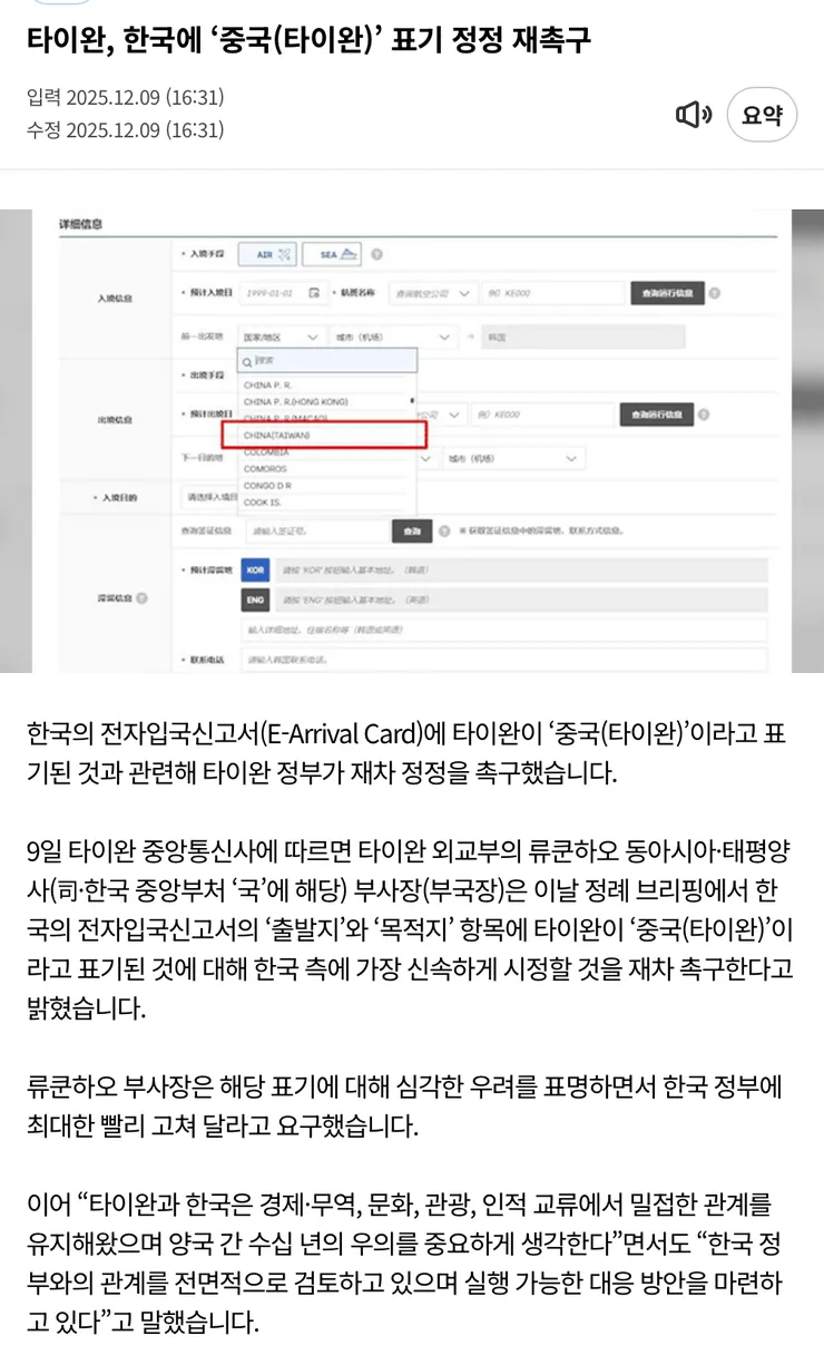 그저께부터 한국 전자입국 신고서에 대만을 CHINA(TAIWAN)이라고 표기됐다는 이유로 한국과의 관계 재검토에 들어간 대만 정부.