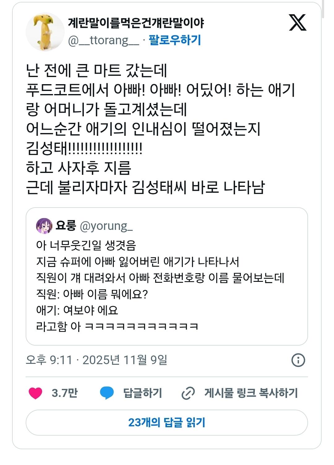 미아가 된 아빠를 찾다가 빡친 아기의 사자후 작성자 정보 최고관리자 작성일 11.12 15:15 컨텐츠 정보 5 조회 0 댓글 0 추천 0 비추천 목록 0 추천 추천 비추천 0 비추천 댓글 로그인한 회원만 댓글 등록이 가능합니다. 이전 다음 목록