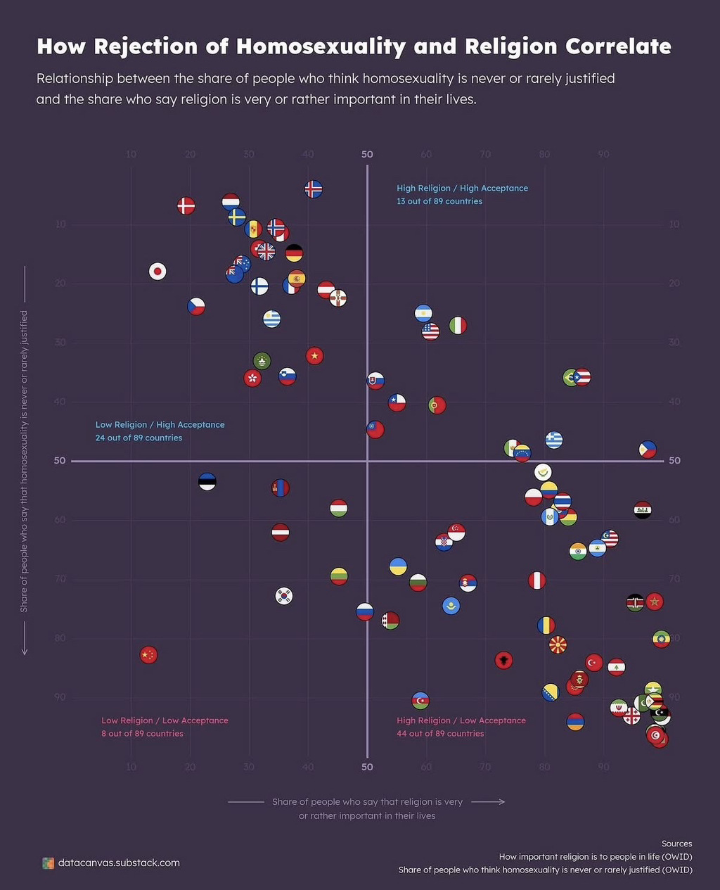 나라별 종교에 대한 입장, 동성애에 대한 입장의 관계 작성자 정보 최고관리자 작성일 11.29 15:29 컨텐츠 정보 2 조회 0 댓글 0 추천 0 비추천 목록 X축 종교에 대한 입장Y축 동성애에 대한 입장1사분면이 종교적으로 신실하면서 동성애에도 관용적인 입장 0 추천 추천 비추천 0 비추천 댓글 로그인한 회원만 댓글 등록이 가능합니다. 이전 다음 목록