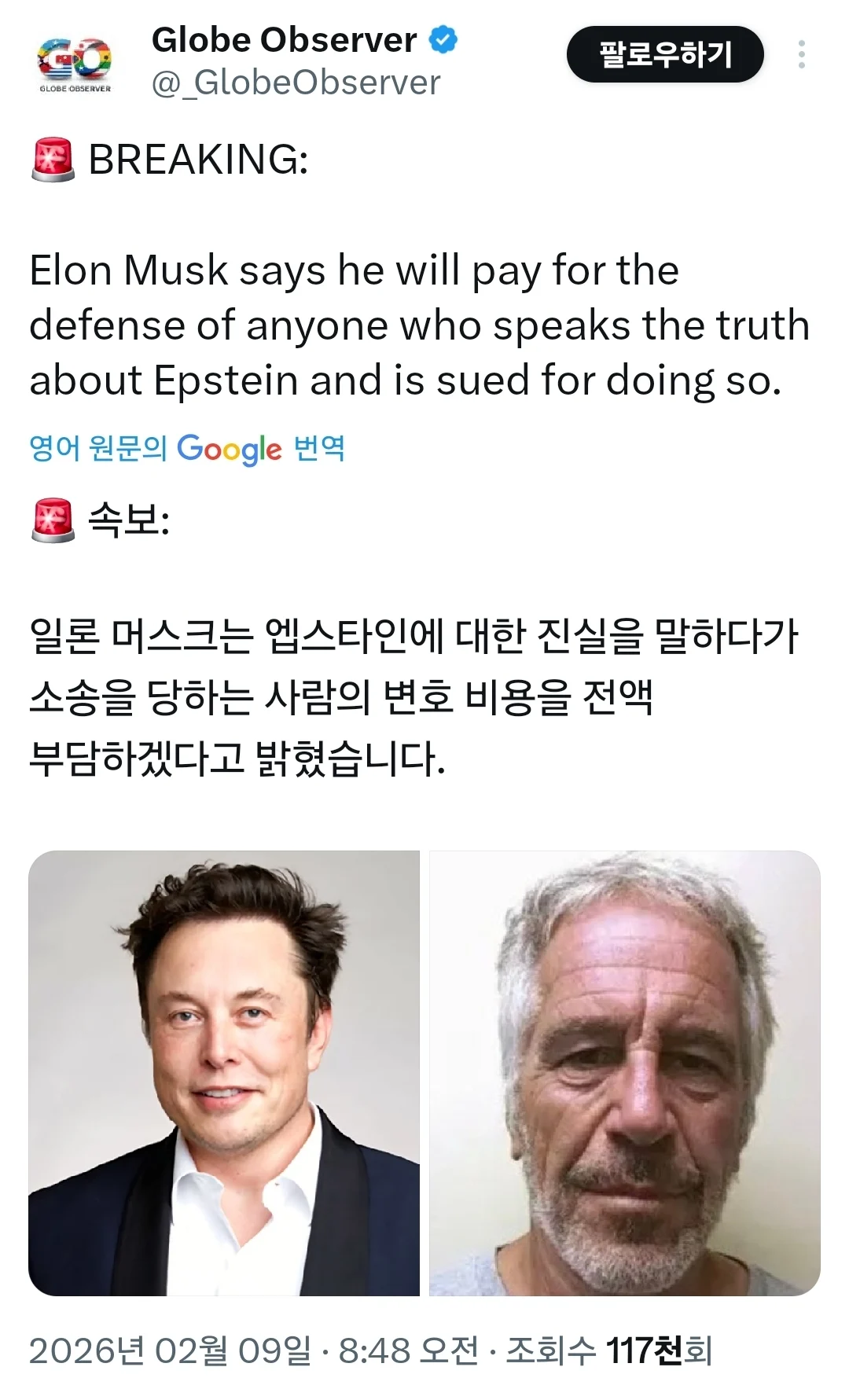 머스크, "엡스타인 사건 관련소송비용 전액 부담하겠다" 작성자 정보 최고관리자 작성일 02.09 13:40 컨텐츠 정보 72 조회 0 댓글 0 추천 0 비추천 목록 0 추천 추천 비추천 0 비추천 댓글 로그인한 회원만 댓글 등록이 가능합니다. 이전 다음 목록
